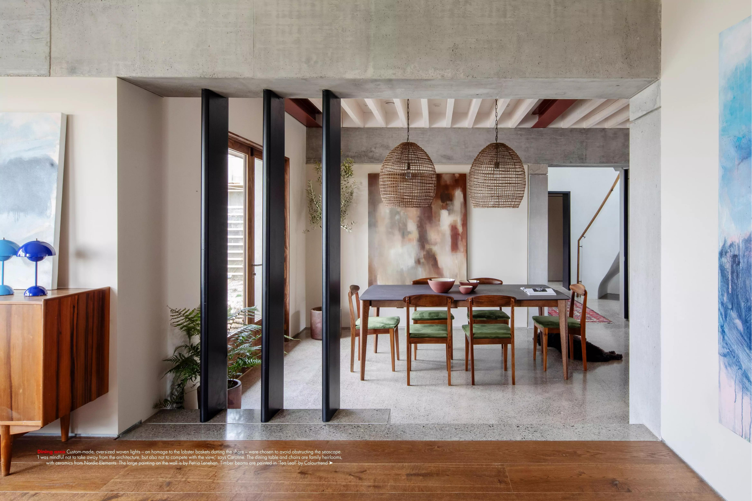 The walls and most of the floors in the house are concrete; the latter polished and the former with a slightly rough finish for a subtle contrast. Flannery felt it was important to balance the robustness of this material with softer textures and she took inspiration from the house’s coastal aspect. “The oversized rattan lampshades above the dining table were inspired by lobster pots,” she says, “but the fact that they were see-through also appealed. I didn’t want anything blocking the views of Dublin Bay.”